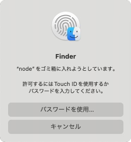 「/usr/local/lib/node_modules」を「rm -rf」のコマンドで一気に削除した場合、この章で書いていることの対応は不要になりますが、参考までに、Finderで削除してどのような事態になったのかを記載しておきます。