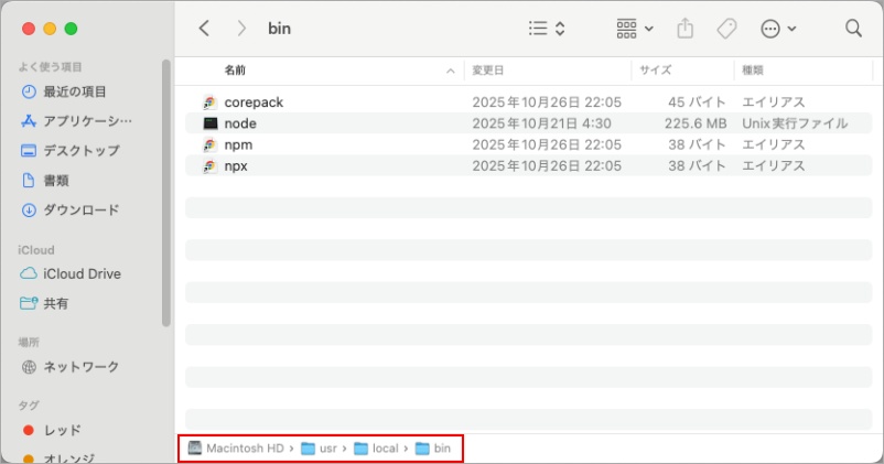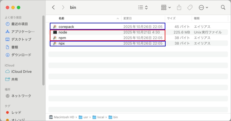 binフォルダに移動しました。「node」と「npm」の他に、「corepack」と「npx」もあることが確認できました。