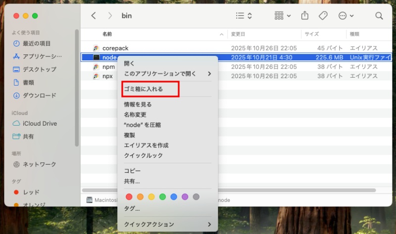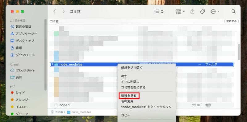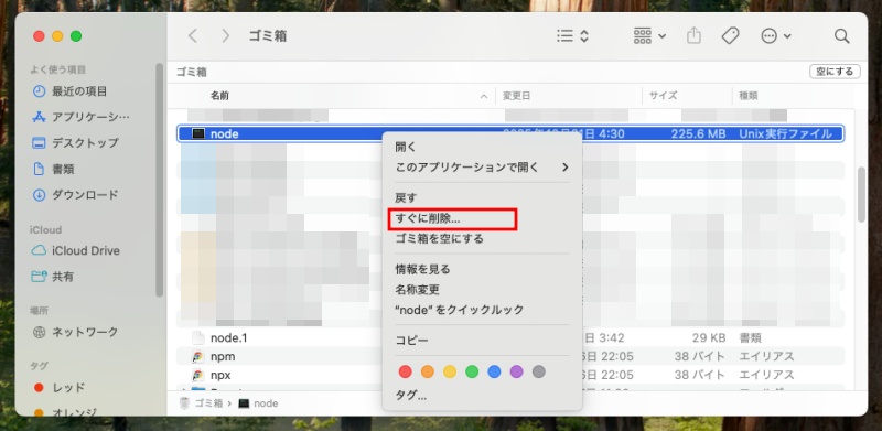 ゴミ箱に入っていた「node_modules」に対して、右クリックして「すぐに削除」を選択しました。