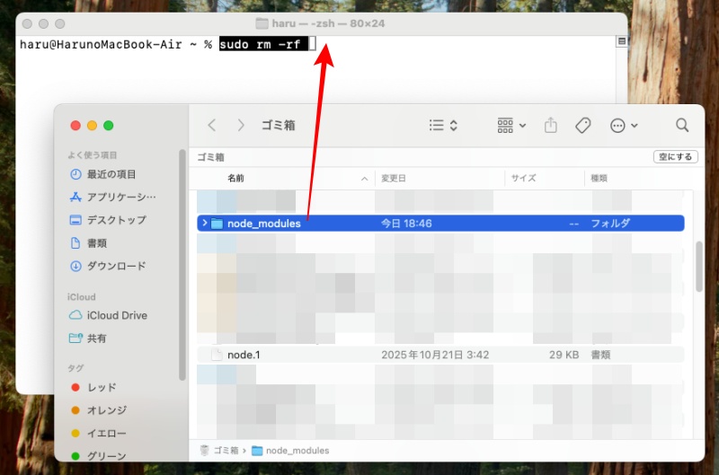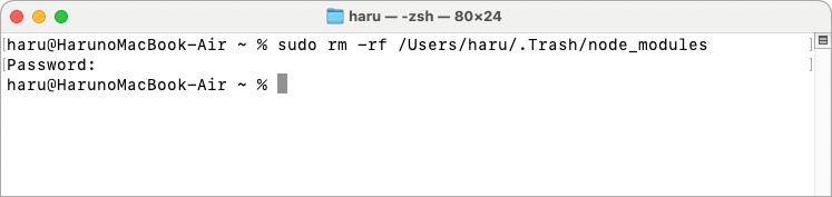 これで、ゴミ箱から手動で削除できなかった「node_modules」のフォルダを削除することができました。