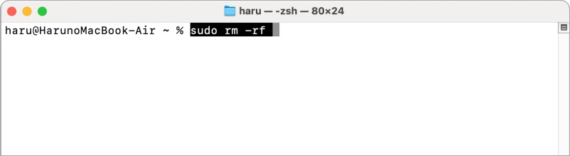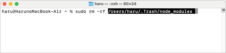 のコマンドを入力し(ここではまだReturnキーは押下しない)、ゴミ箱にある削除したいフォルダをターミナルにドラッグ&ドロップして、フォルダのパスを自動で取得しました。
