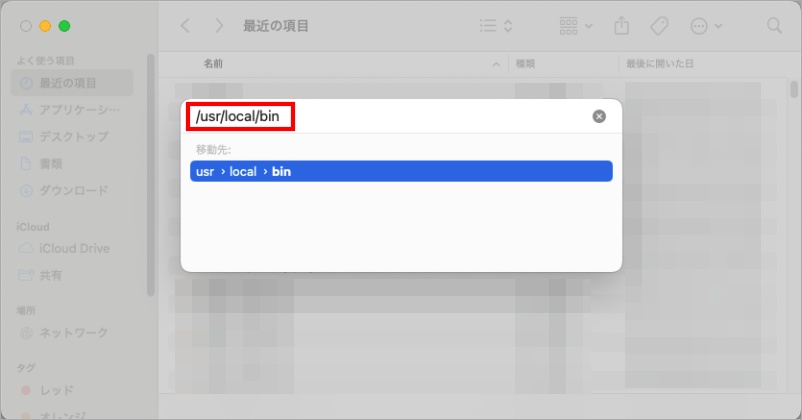 「/usr/local/bin/」と入力して、Returnキーを押下します。