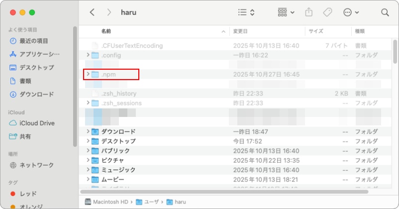 隠しフォルダを表示します。キーボードで、Command + Shift + .(ピリオド)キーを同時に押します。「.」がフォルダ名の先頭にあるものが隠しフォルダになります。「.npm」がキャッシュのフォルダになります。