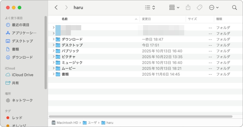 安全のため、必要に応じて再度 Command + Shift + .(ピリオド)を押下することで隠しフォルダを非表示にします。
