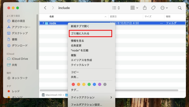 隠しフォルダの場合でも同様で、右クリックして「ゴミ箱に入れる」で実行できます。隠しフォルダは、Command + Shift + .(ピリオド)キー で表示/非表示の切り替えができます。