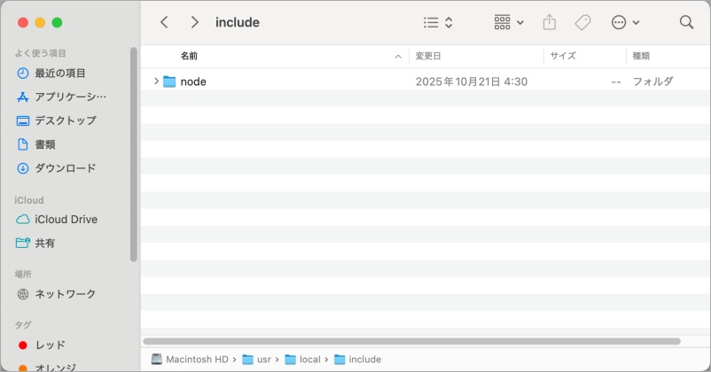 同様に /usr/local/include/ に移動すると、「node」があることが確認できます。