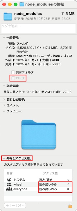 「node_modules」を右クリックして「情報を見る」を選択します。