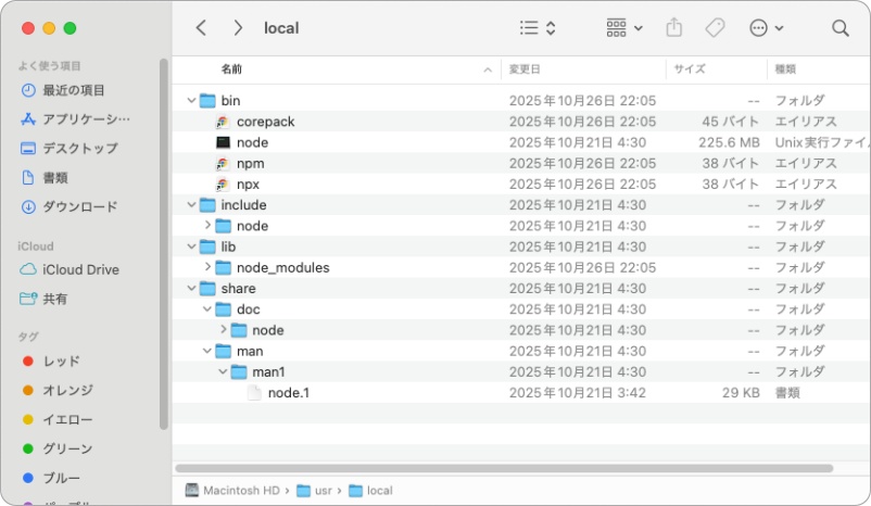 私はこのときMacを新しくしたばかりということもあり、システム関連のファイルが少ないため比較的簡単にNode.jsに関連するファイル/フォルダを見つけることができました。
