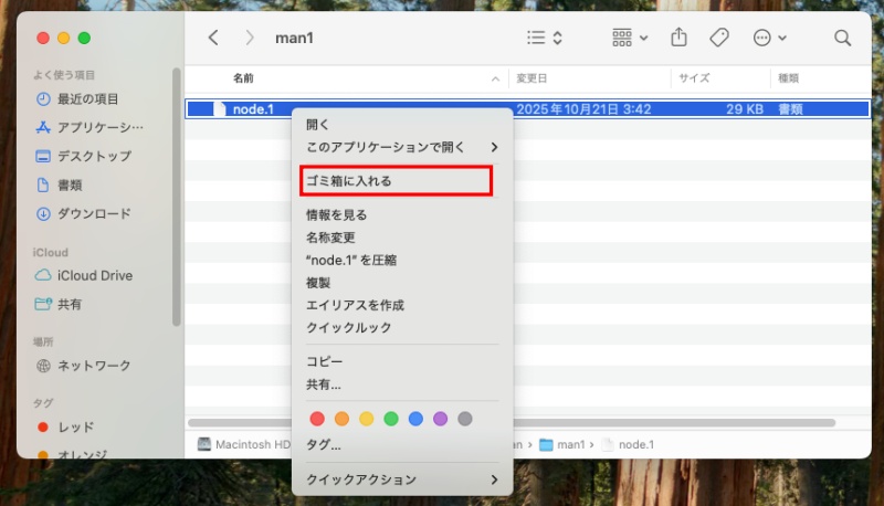 注意点として、上位の「man1」のフォルダは削除NGです!このフォルダはmacOSの標準フォルダになります。