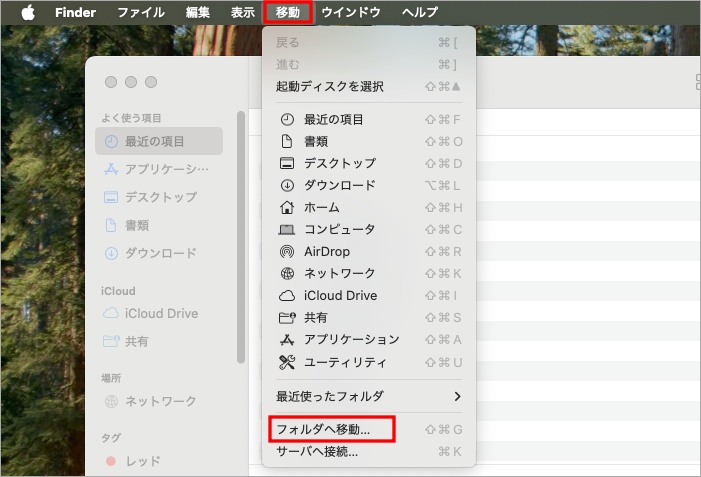 Finderを選択した状態で、移動→フォルダへ移動、と進みます。