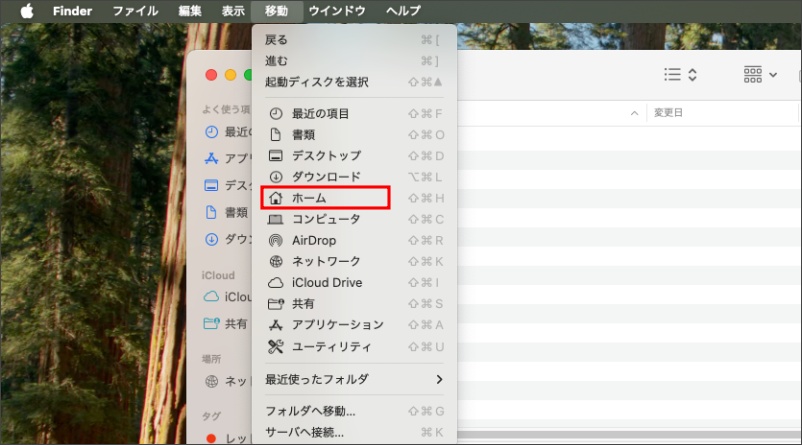 ホームフォルダへ移動します。Finderを選択した状態で、移動→ホーム、と進みます。