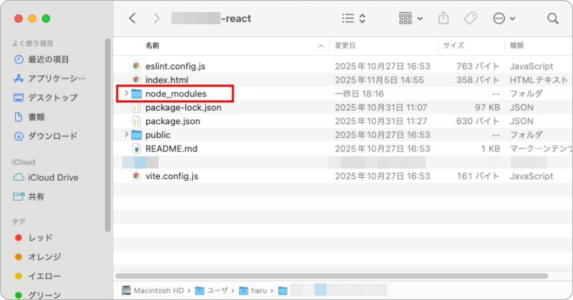 先に「/usr/local/lib/node_modules」は削除対象として確認したのですが、「node_modules」というフォルダは、プロジェクトのフォルダにも格納されています。