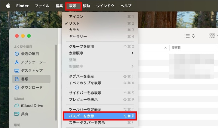 パスバーを表示したい場合は、Finderを選択した状態で、表示→パスバーを表示、と進みます。